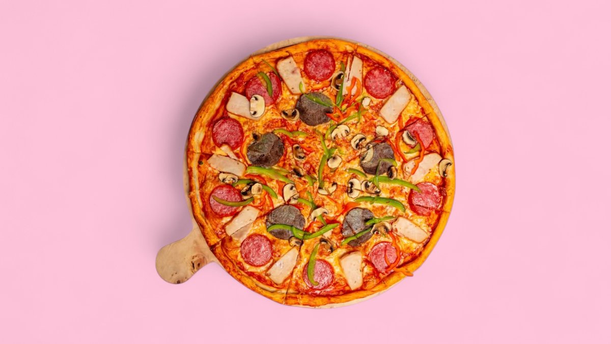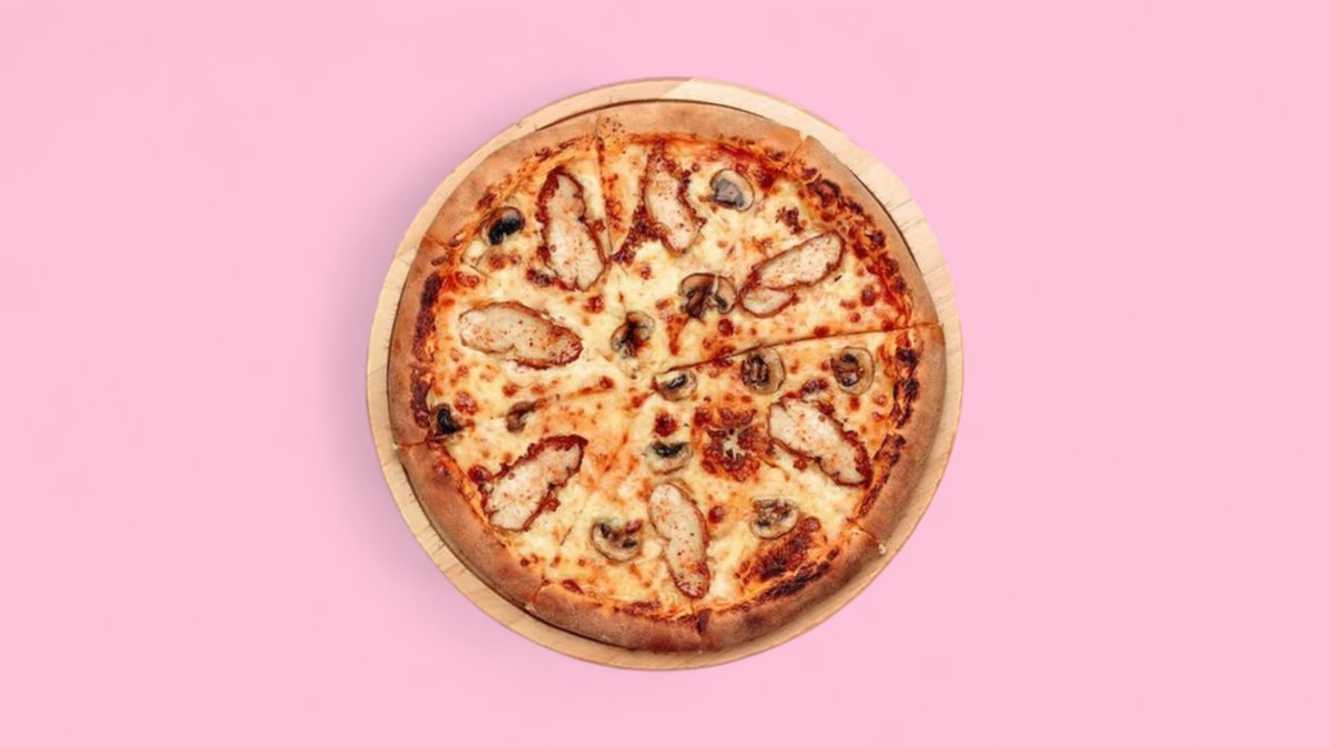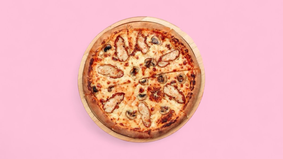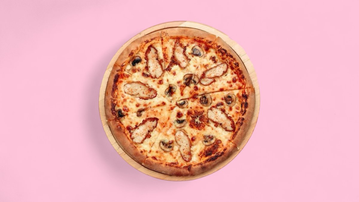 тесто, копченная колбаса, болгарский перец, индейка, казы, соус, сыр, грибы