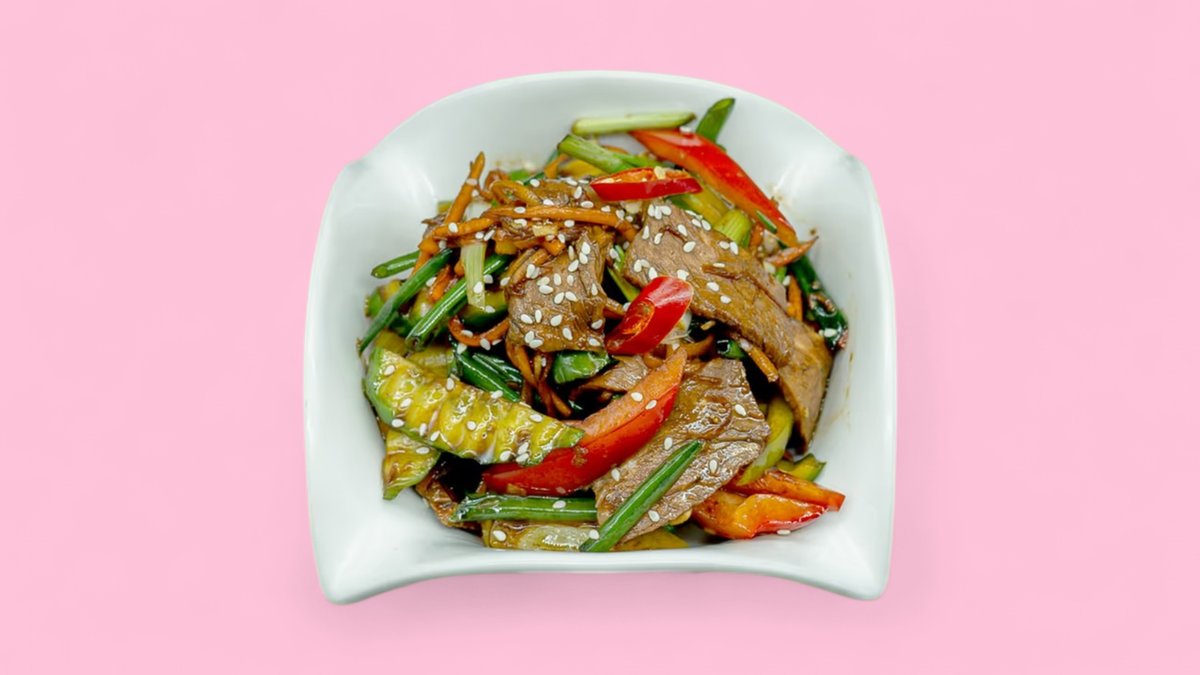 говядина, огурцы, болгарский перец, лук, кинза, соевой соус, помидор