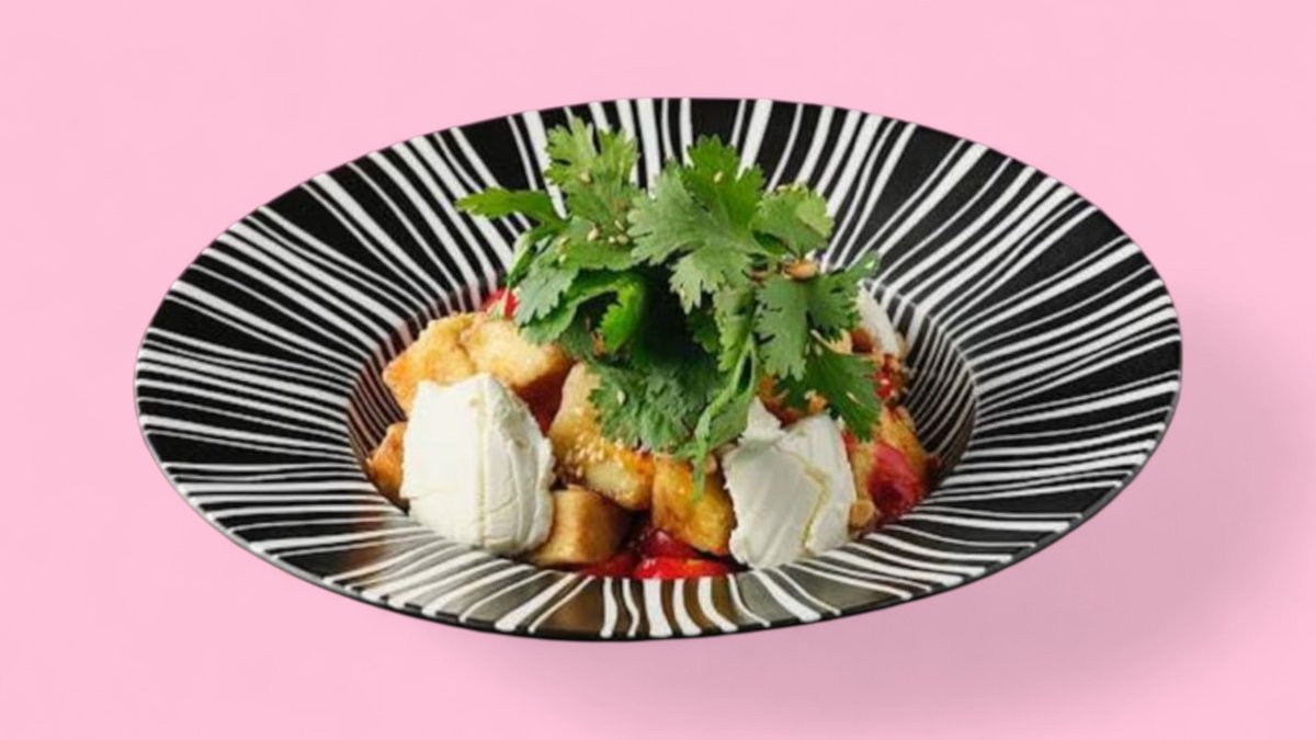 баклажаны, помидор черри, творожный сыр, соус сладкий