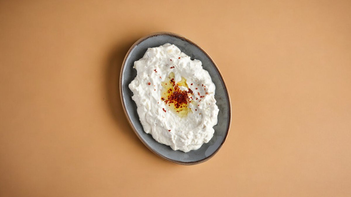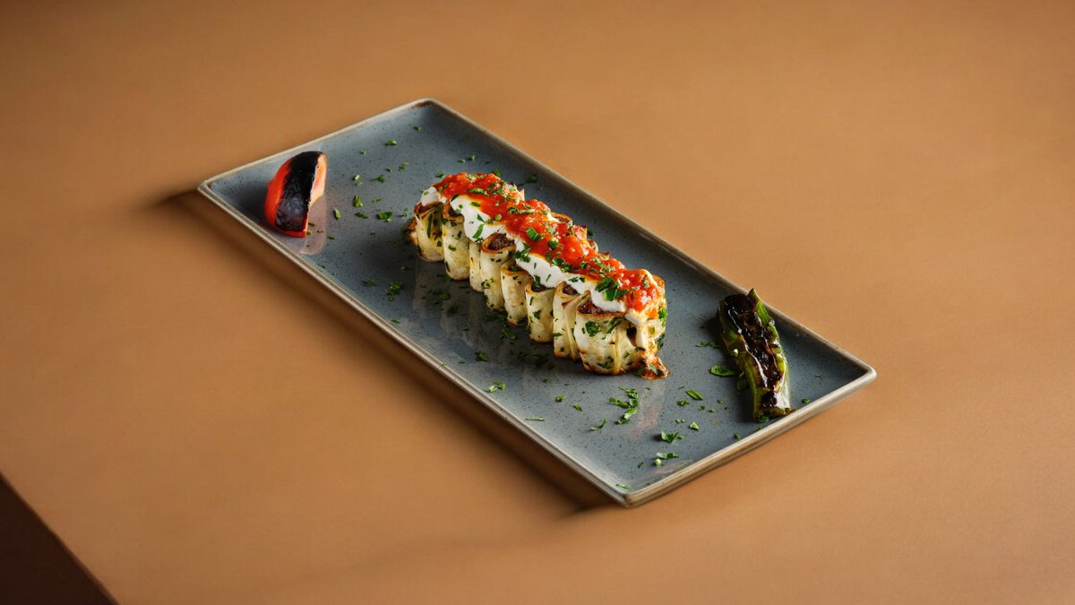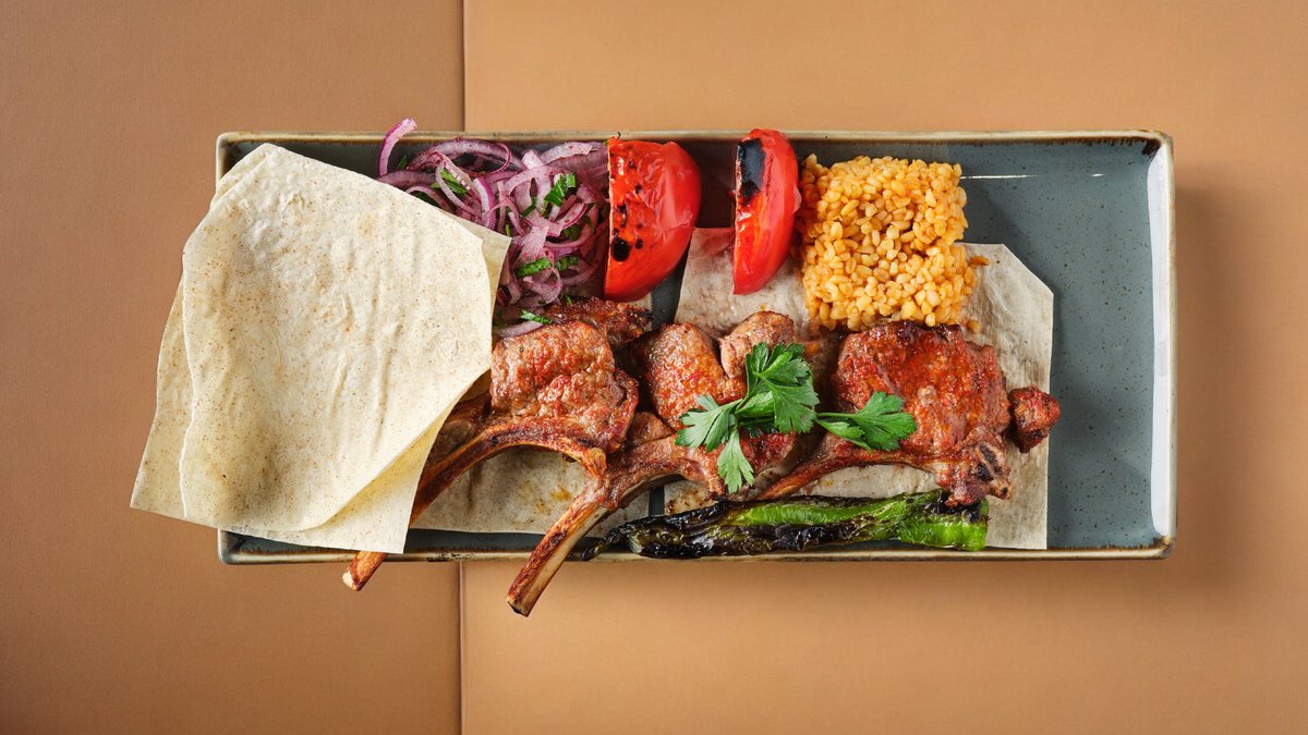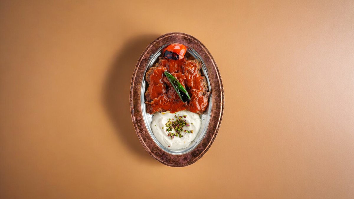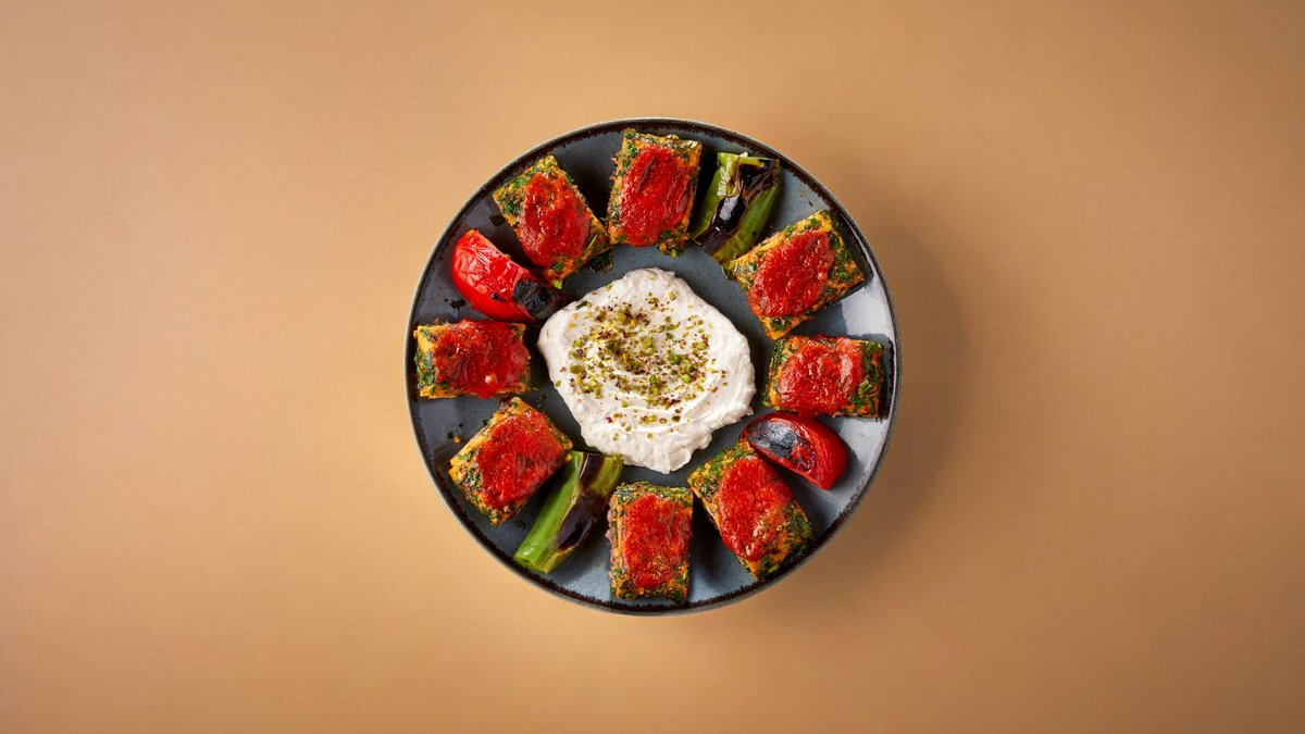 Баранина фаршированная с томатным и сливочным соусом, йогурт с фисташками подаётся с нарезанным лавашом