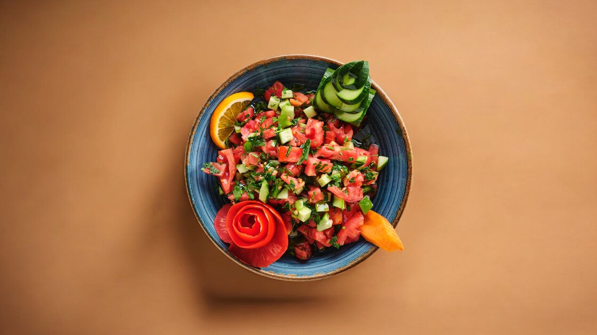Салат из нарезанных кубиками помидоров и огурцов с лимонной заправкой, смешанной с мелко нарезанным болгарским перцем