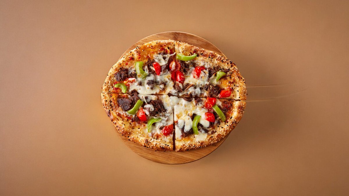 Сырное пиде из тандырного мяса (бастурмы) с помидорами и болгарским перцем