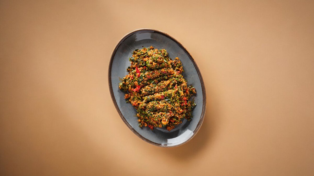 Салат из булгура, смешанный с петрушкой, зеленым луком, мятой и оливковым маслом