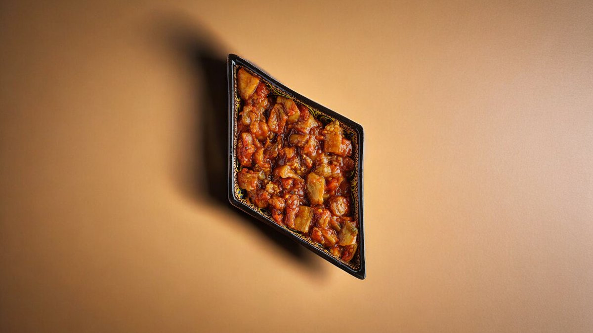 Кусочки куриного мяса на смеси йогурта,баклажанов и чесночного пюре