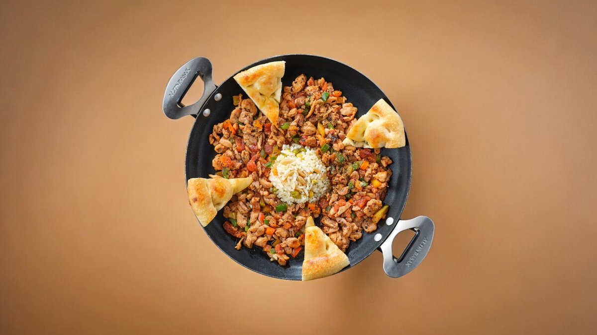 Обжаренная курица с варенным рисом, помидоры и зеленый перец на традиционной турецкой сковороде