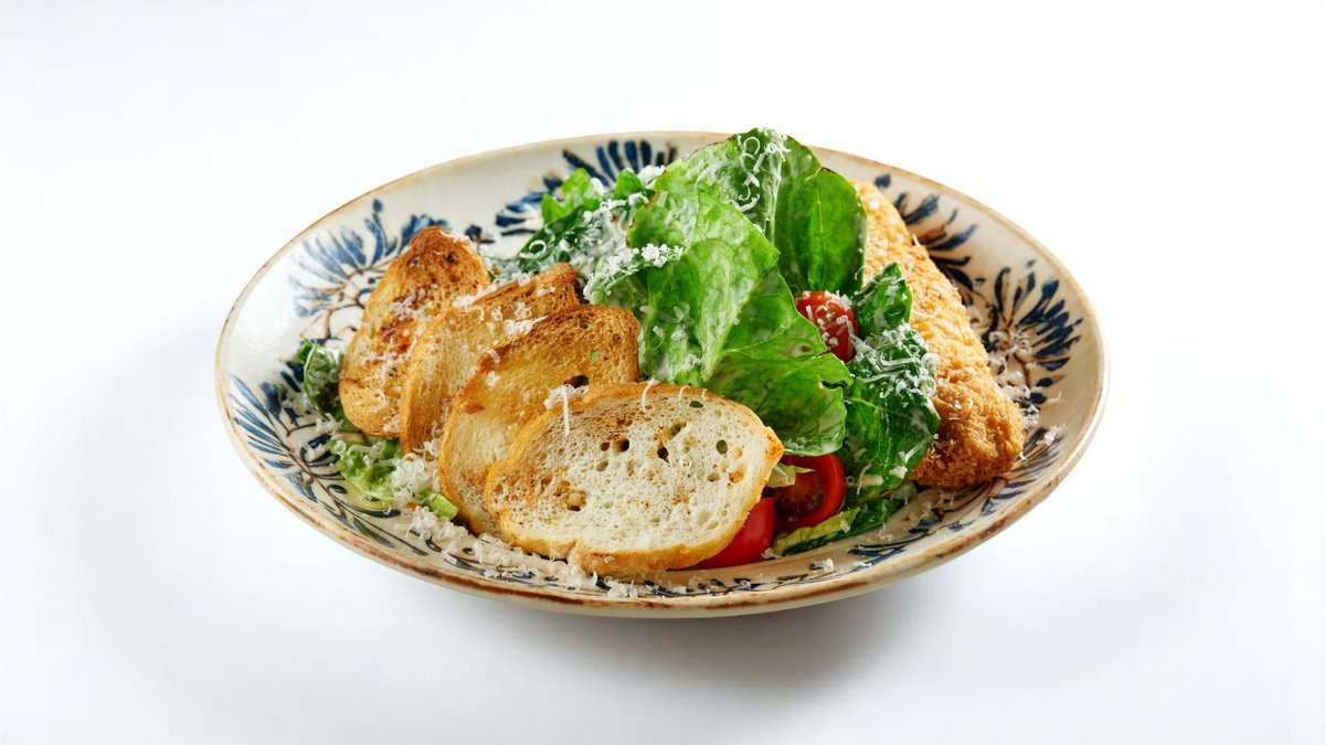 Листья салата, помидоры, ломтики зелёных оливок, подаётся с соусом из пасты из черных оливок