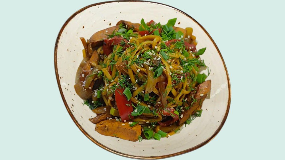 Перец три колор, лук репчатый, баклажан, кабачки, помидоры, мясо говяжье, тамтный соус, соя.