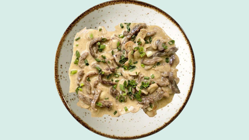 Грибы, сливки, мясо говяжье.