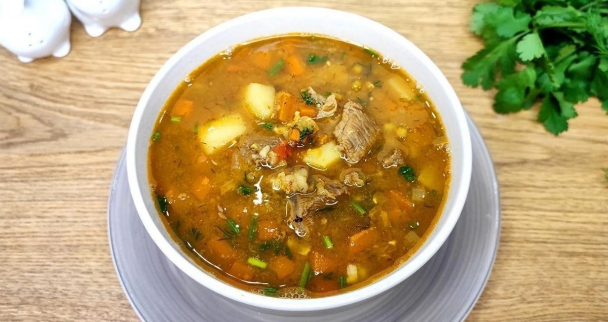 Говяжье мясо, маш, рис, картофель, морковь, лук, болгарский перец, помидор, чеснок, кефир, зелень
