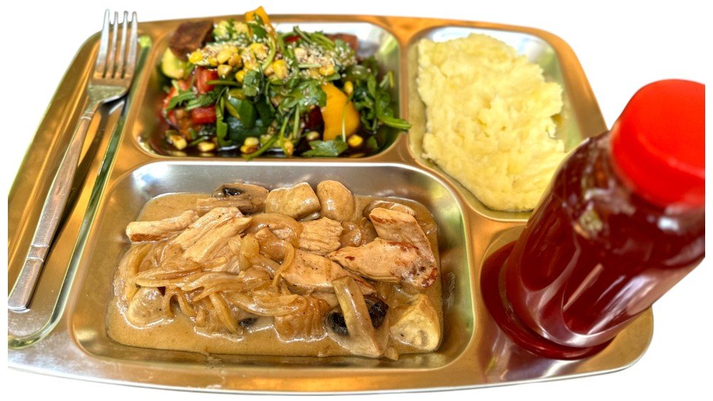 Курица с грибами с пюре, салат Аура и компот