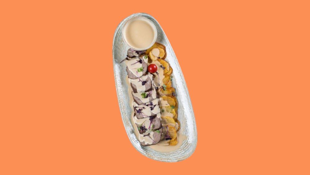 Вырезка говядины, картофель, маринованные огурцы, яйцо, шампиньоны, сливочно - грибной соус, валеные томаты