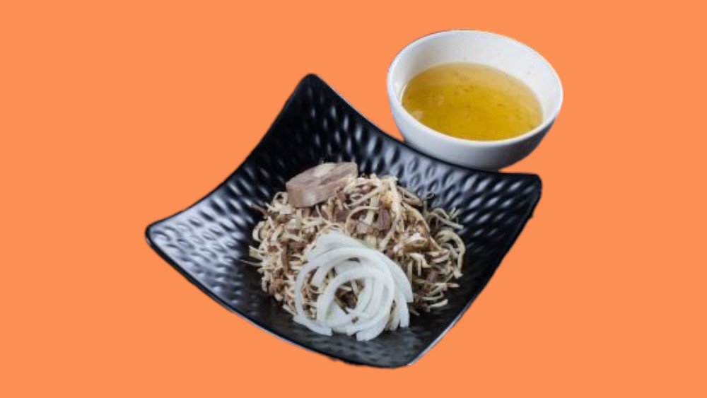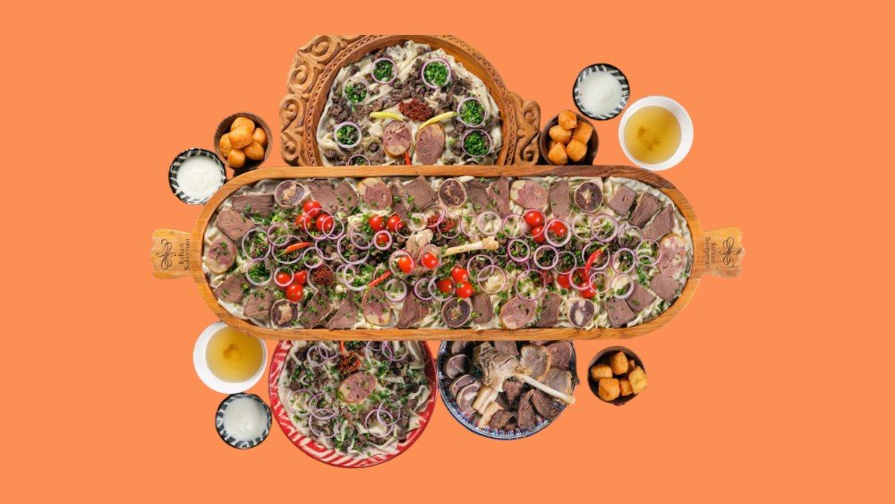 Мясо конины, мясо говядины, казы конина, карта, баранья голень, домашнее тесто, лук шалот, лук зелёный, помидоры черри, вяленые томаты, бульон конина, боурсаки, кислое молоко