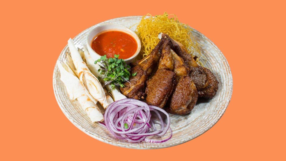 Говяжьи ножки, сухари из лаваша, чесночная паста, зелень, лук