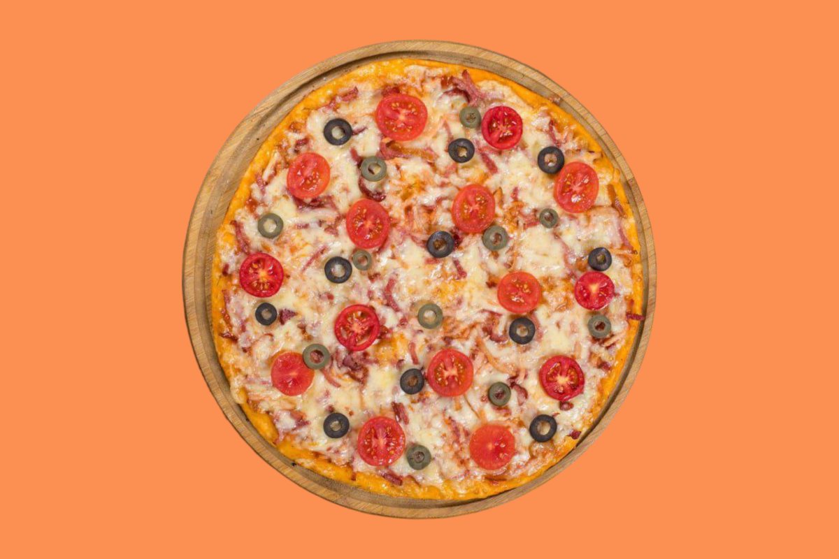 Сдобное тесто, оливки, маслины, томатный соус, грибы, индейка, колбаса, сыр