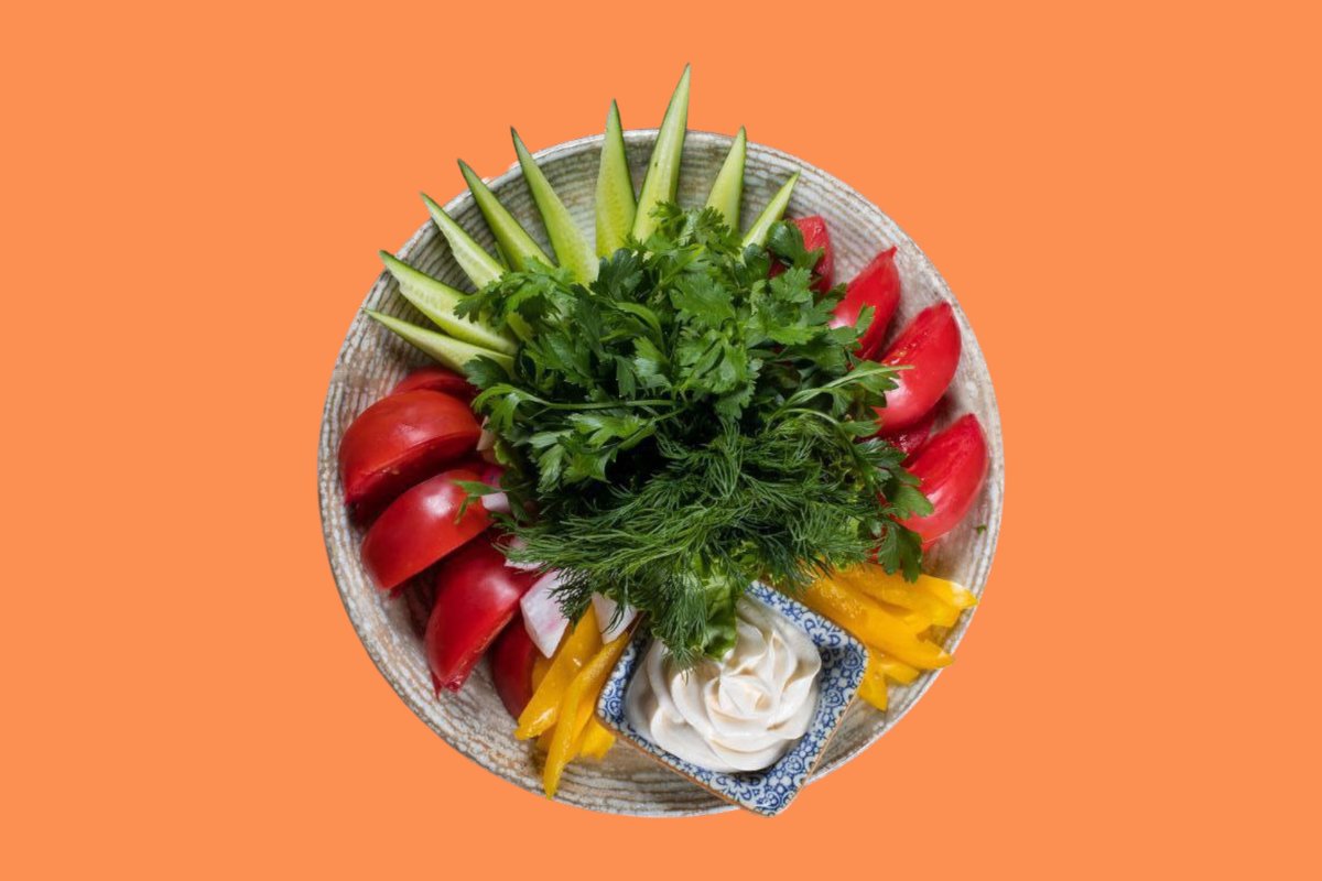 Помидоры, огурцы, говядина, болгарский перец, кинза, кунжут, соя
