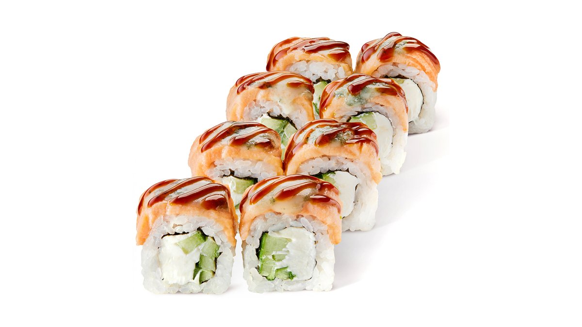Лосось, сливочный творожный сыр и свежий огурец, подчеркиваются пикантным миксом спайс и соусом терияки. Икра масаго добавляет лёгкую солёность, а зелёный лук придаёт свежести и аромат.