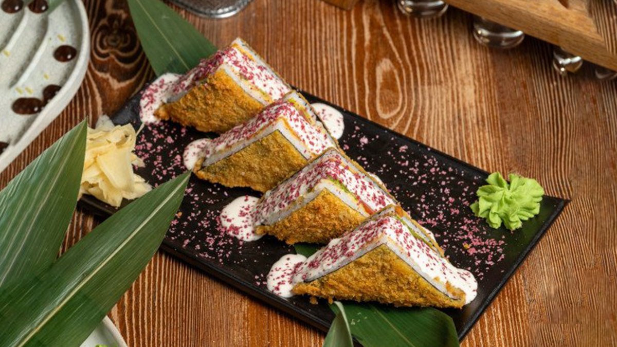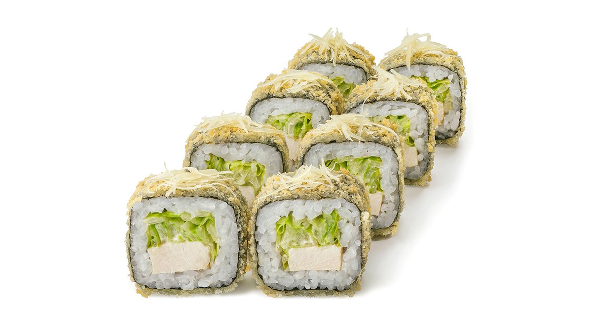 Ролл с нежным рисом, куриной грудкой, хрустящим салатом айсберг и пикантным соусом цезарь. Ароматный пармезан и хрустящие нори дополняют вкус, а сухари панко добавляют аппетитную текстуру (8 шт.)