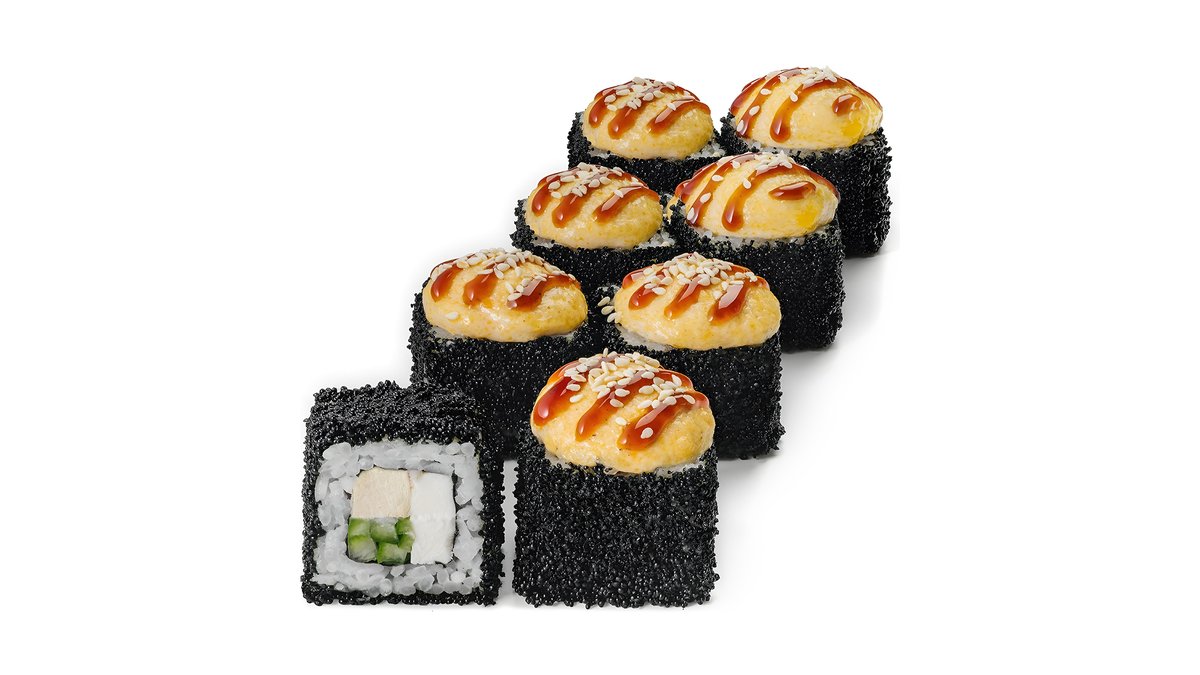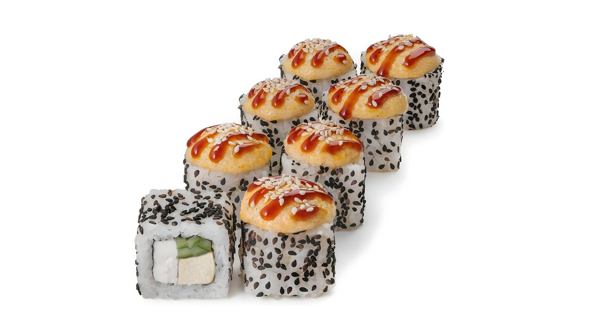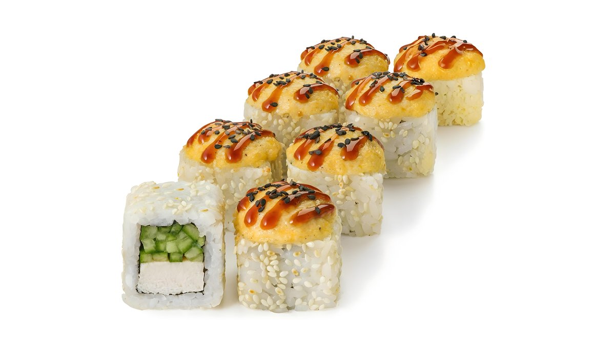 Ролл с нежным рисом и хрустящими нори, свежим огурцом и мягким крем-чизом. Куриной филе и запечённая шапочка создают насыщенный вкус и аппетитную текстуру (8 шт.)