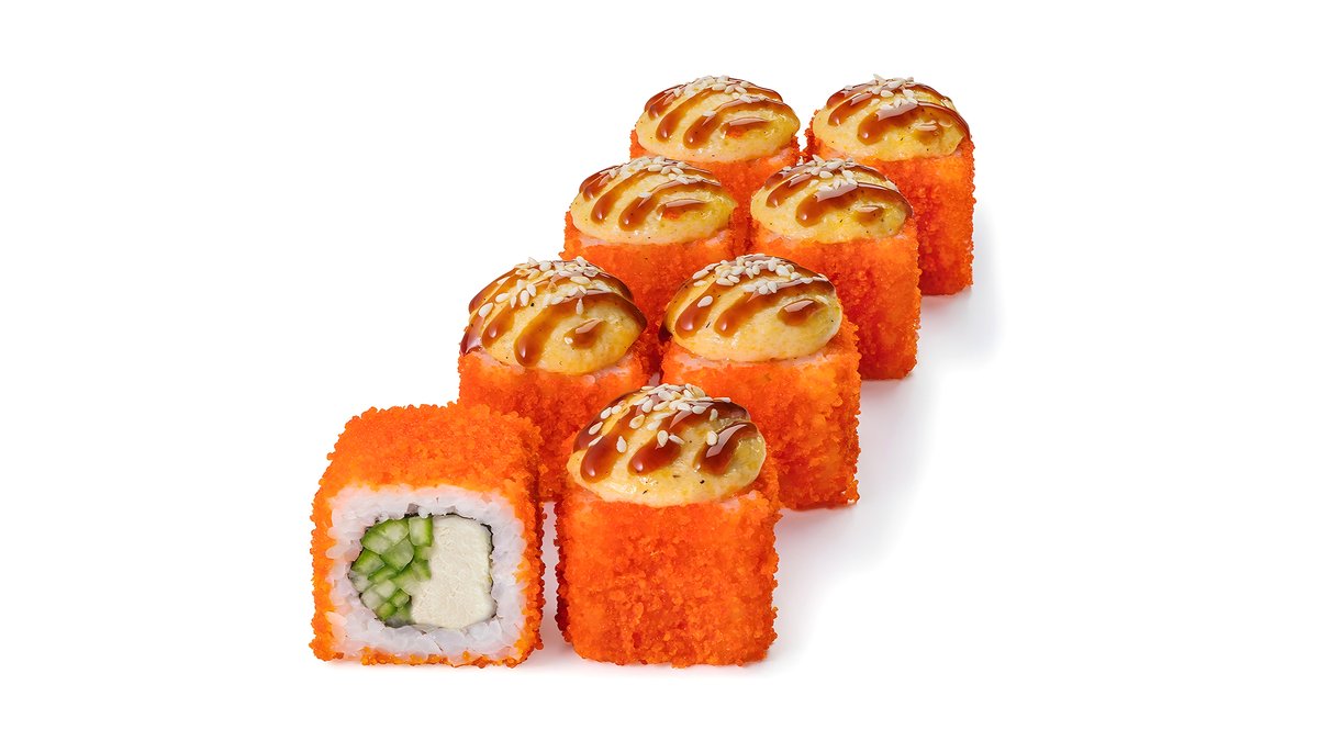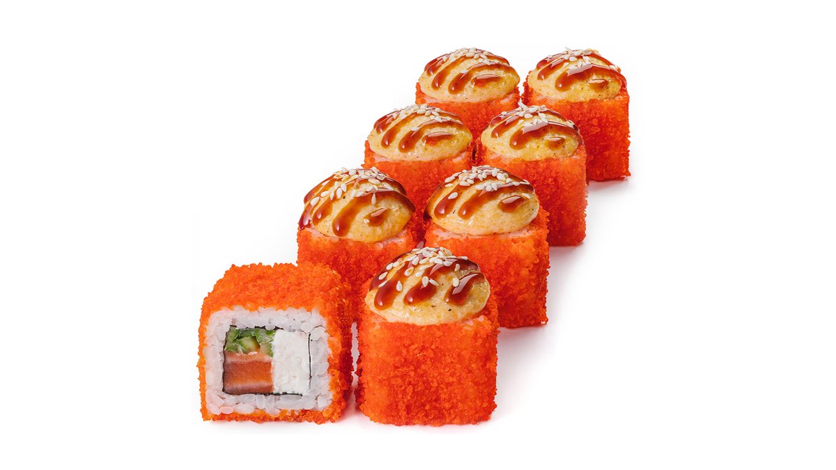 Сочный жареный лосось, сливочный сыр и свежий огурец, гармонично сочетаются с белым соусом и соусом терияки, создавая восхитительный баланс вкусов. Икра масаго добавляет лёгкую солёную нотку (8 шт.)
