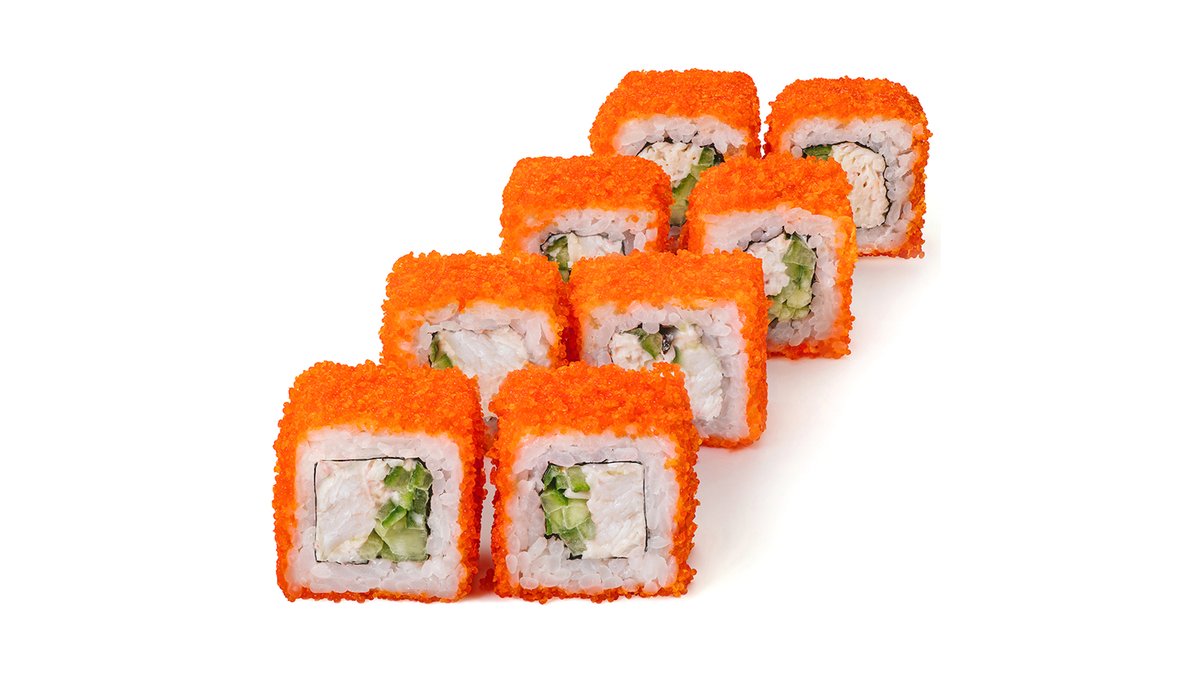 Ролл с курином филе и хрустящим огурцом, завернутый в рис и нори. Украшен яркой икрой масаго, которая добавляет легкую пикантность. (8 шт.)