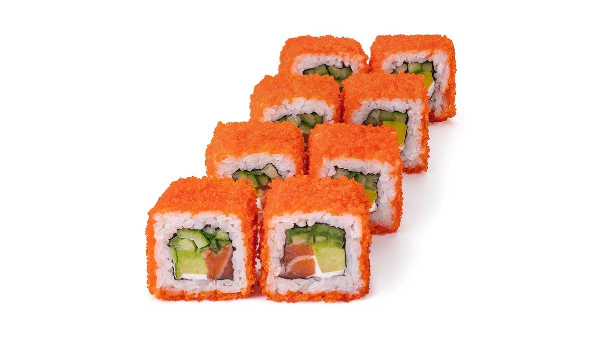 Ролл с нежным лососем, сливочным авокадо и хрустящим огурцом, завернутый в рис и нори. Украшенный икрой масаго (8 шт.)