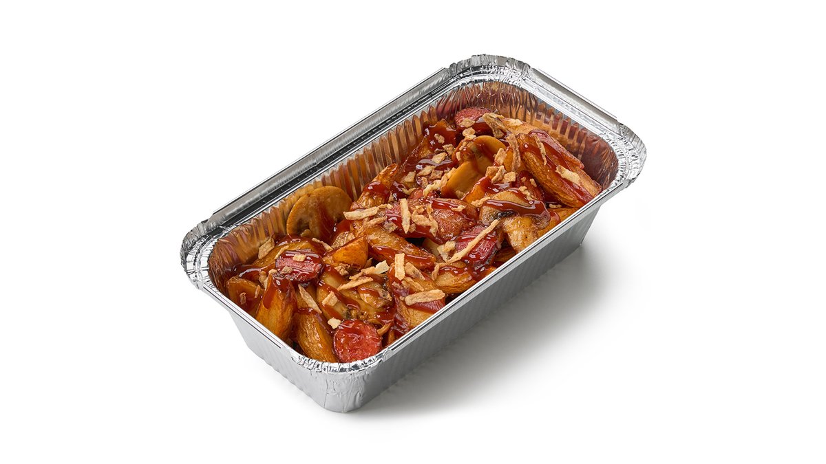 Жареный картофель по-деревенский в соусе барбекю с шампиньонами, канадский сосисками и жареным луком. В комплекте: Вилка (1 шт.)