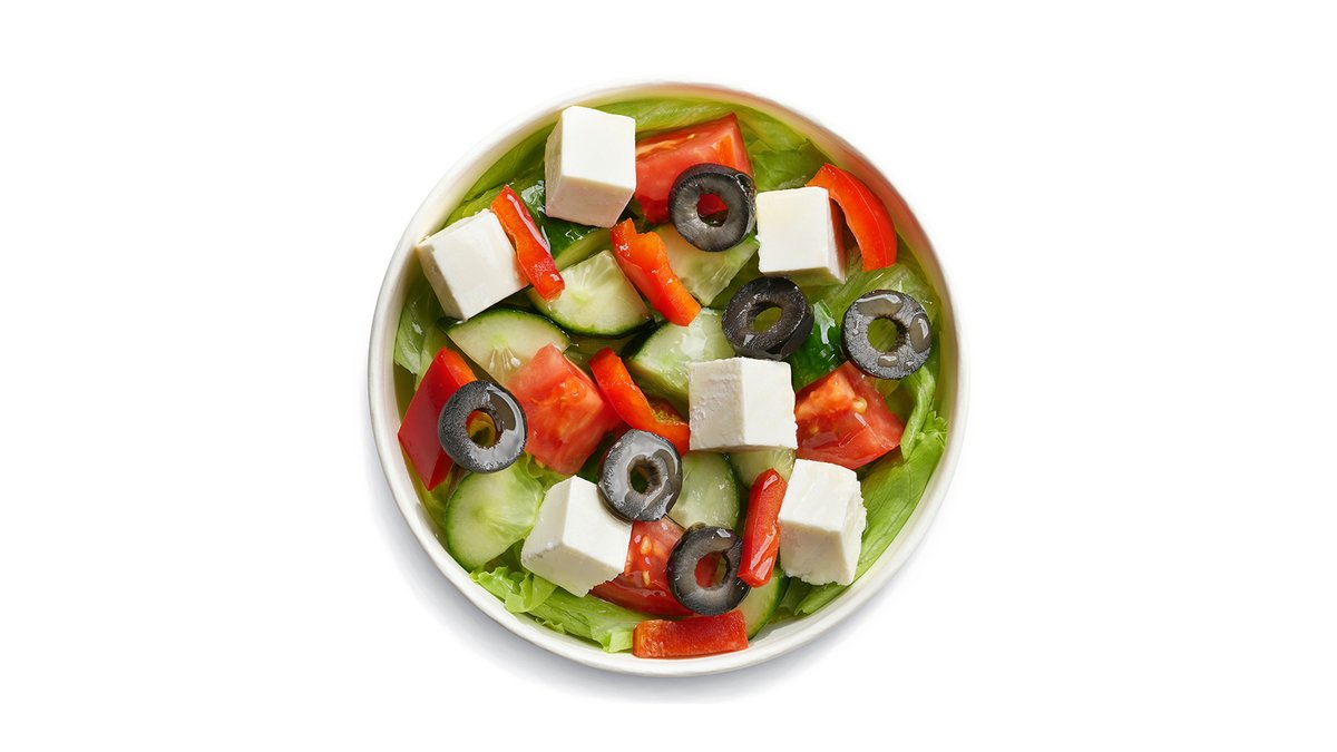 Свежий и яркий салат с сочными помидорами, хрустящими огурцами, сладким перцем и нежным айсбергом. Нежная фета и пикантные маслины добавляют насыщенности, а оливковое масло подчеркивает натуральный вкус овощей. В комплекте: Вилка (1 шт.)