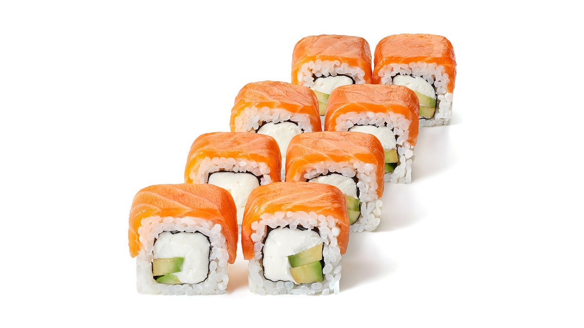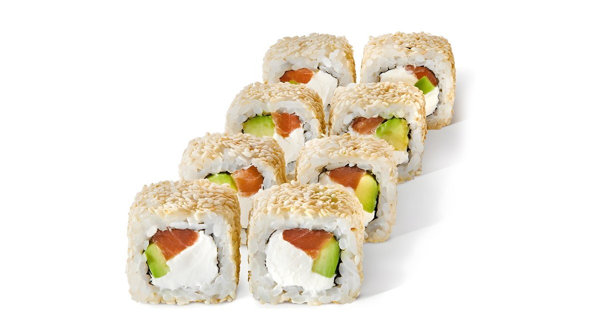 Ролл с нежным сочетанием свежего авокадо, сочного лосося и сливочного творожного сыра, завернутый в рис и нори. Сверху украшен ароматным кунжутом. (8 шт.)