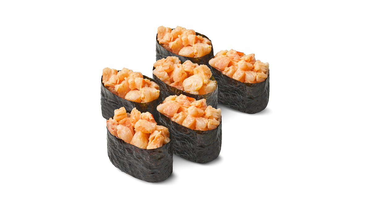 Гунканы с куриным филе, рисом и пикантным соусом спайси, завернутые в хрустящие нори. В комплекте соевый соус, васаби, имбирь, палочки (6 шт.)
