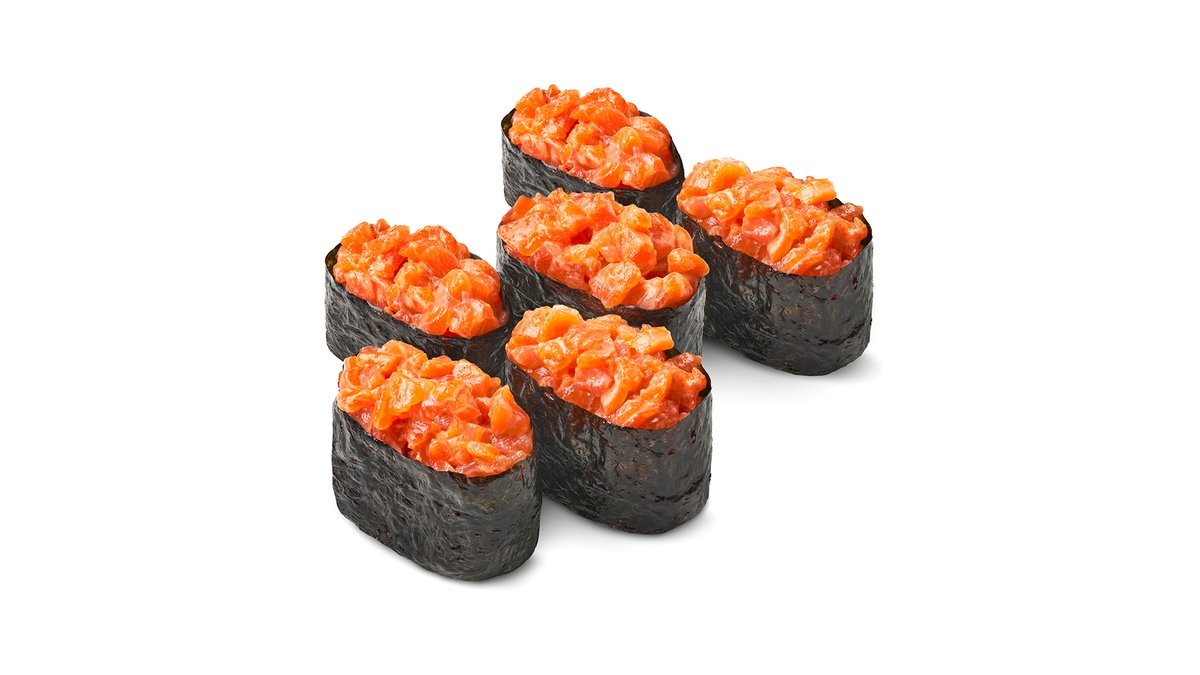 Гунканы с лососем, ароматным рисом и пикантным соусом спайси, завернутые в хрустящие нори. В комплекте соевый соус, васаби, имбирь, палочки (6 шт.)
