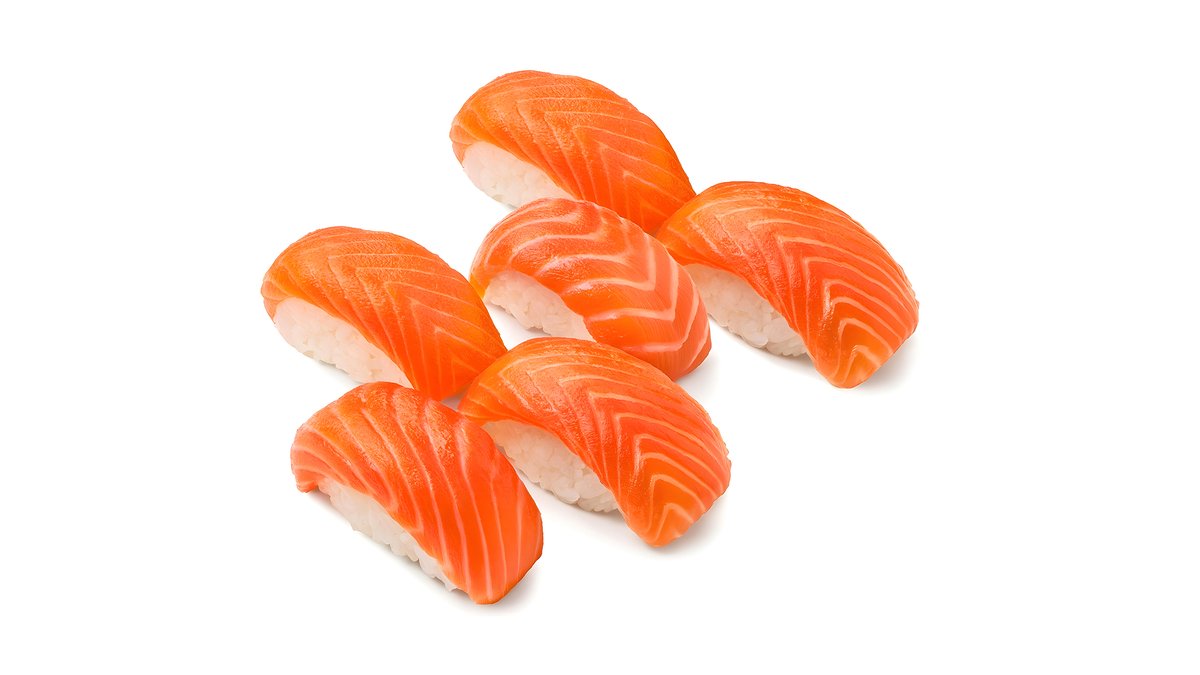 Суши с нежным лососем, завернутые в рис. В комплекте соевый соус, васаби, имбирь, палочки (6 шт.)