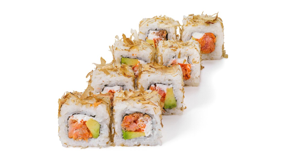 Ролл с нежным рисом, лососем, свежим огурцом, сливочным сыром и хрустящими нори. Дополнен свежим авокадо, ароматной стружкой тунца и хрустящими сухарями панко. (8 шт.)