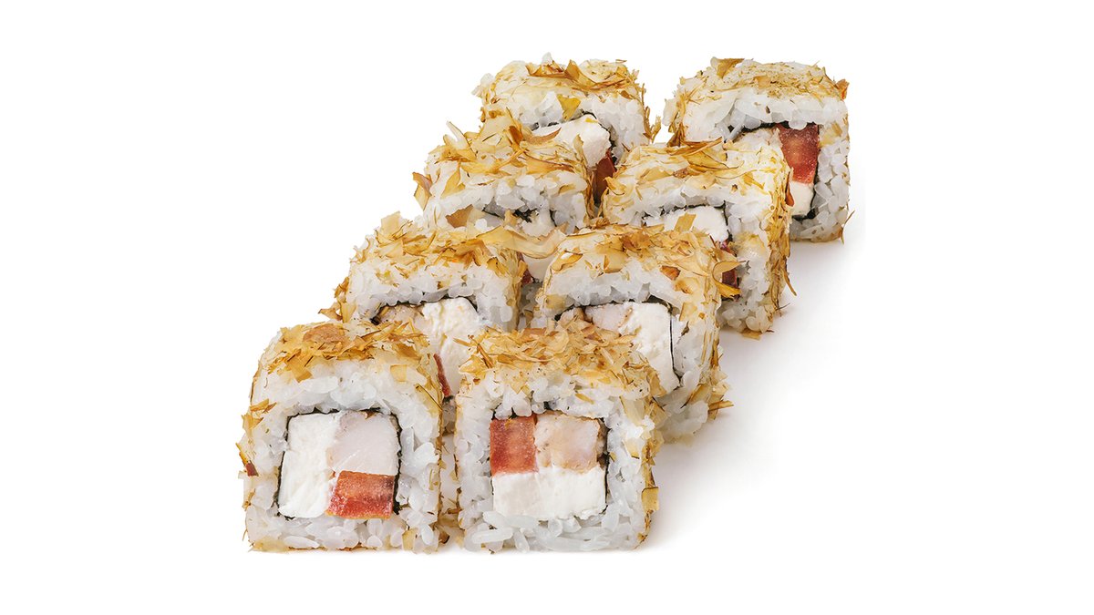 Ролл с сочной курочкой, нежным сыром и свежим помидором, завернутый в рис и нори. Украшенный стружкой тунца (8 шт.)