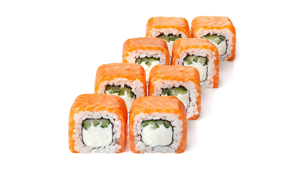 Ролл с нежным лососем, сливочным сыром и хрустящим огурцом, завернутый в рис и нори. Простота и гармония вкусов: свежесть, нежность и легкая сладость лосося в каждом кусочке (8 шт.)