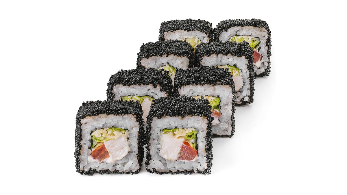 Ролл с копченой куриной грудкой, свежими помидорами и хрустящими салатными листьями, дополненный сыром пармезан. Завернут в рис и нори, политый соусом цезарь и украшенный икрой масаго (8 шт.)