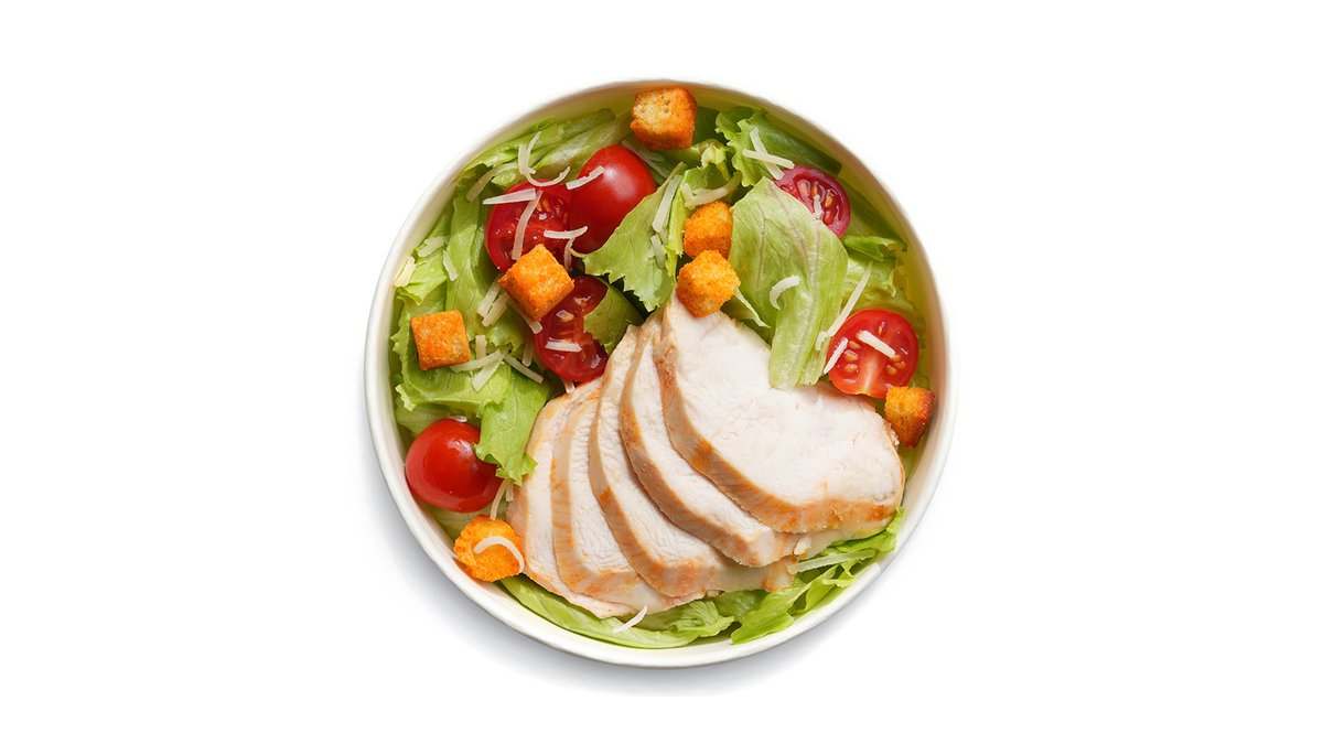 Сытный салат с ароматной куриной грудкой, сочными помидорами черри и хрустящим айсбергом. Аппетитные гренки и тертый пармезан добавляют текстуру, а пикантный соус цезарь завершает вкус