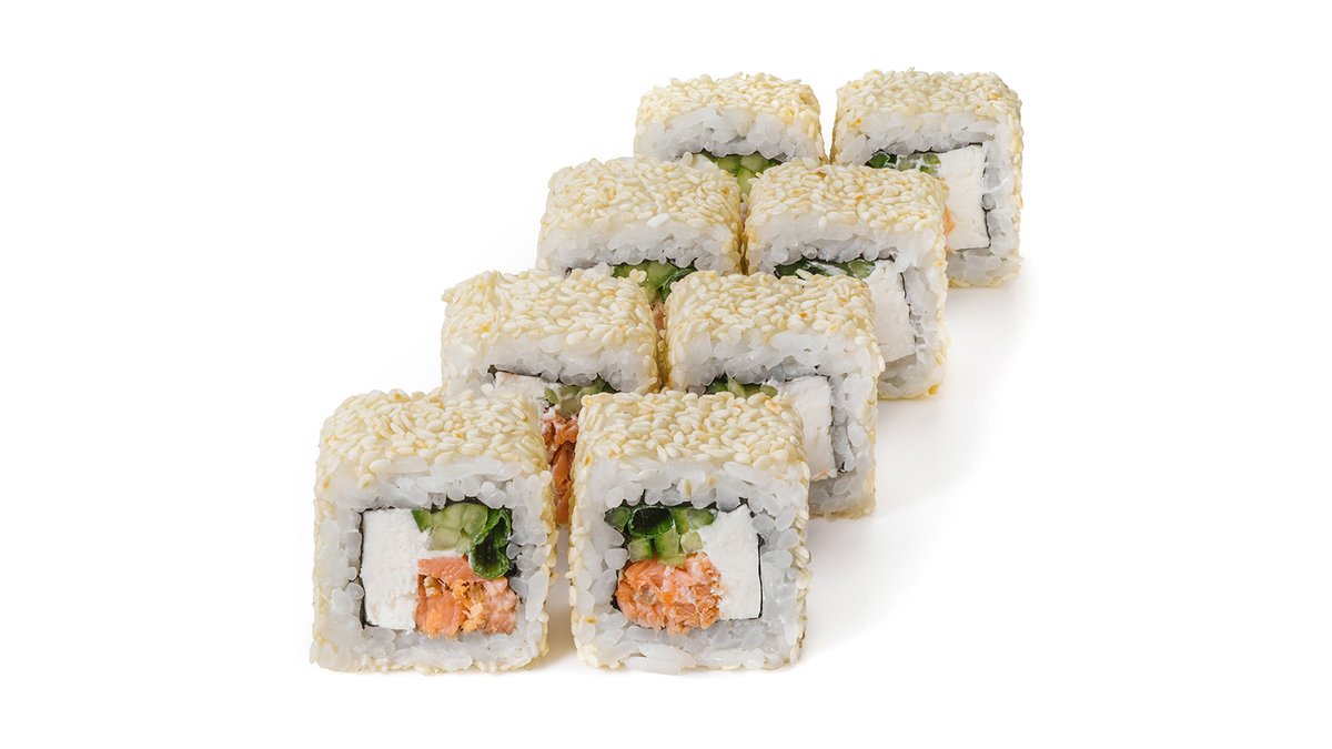 Сочный лосось, сливочный сыр, хрустящий огурчик и яркая икра масаго, дополненные ароматным кунжутом. (8 шт.)