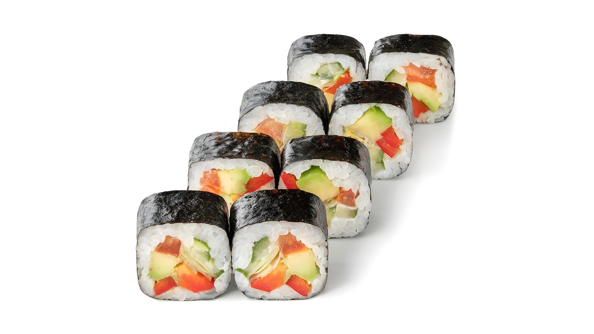 Ролл с ярким сочетанием свежих овощей: помидор, болгарский перец, авокадо, огурец и хрустящий айсберг. Дополнен свежим авокадо и нежным майонезом, завернут в рис и нори. (8 шт.)