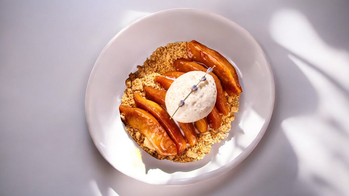 Изысканный десерт с франжипаном, Карамелизированной айвой и мороженным из грецкого ореха