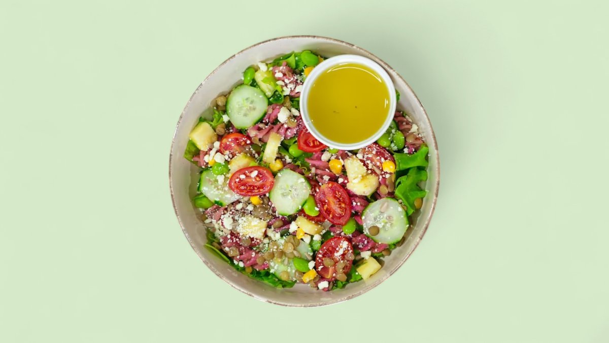 Sallatë e gjelbërt, pasta integrale me pesto të rrepës, ananas