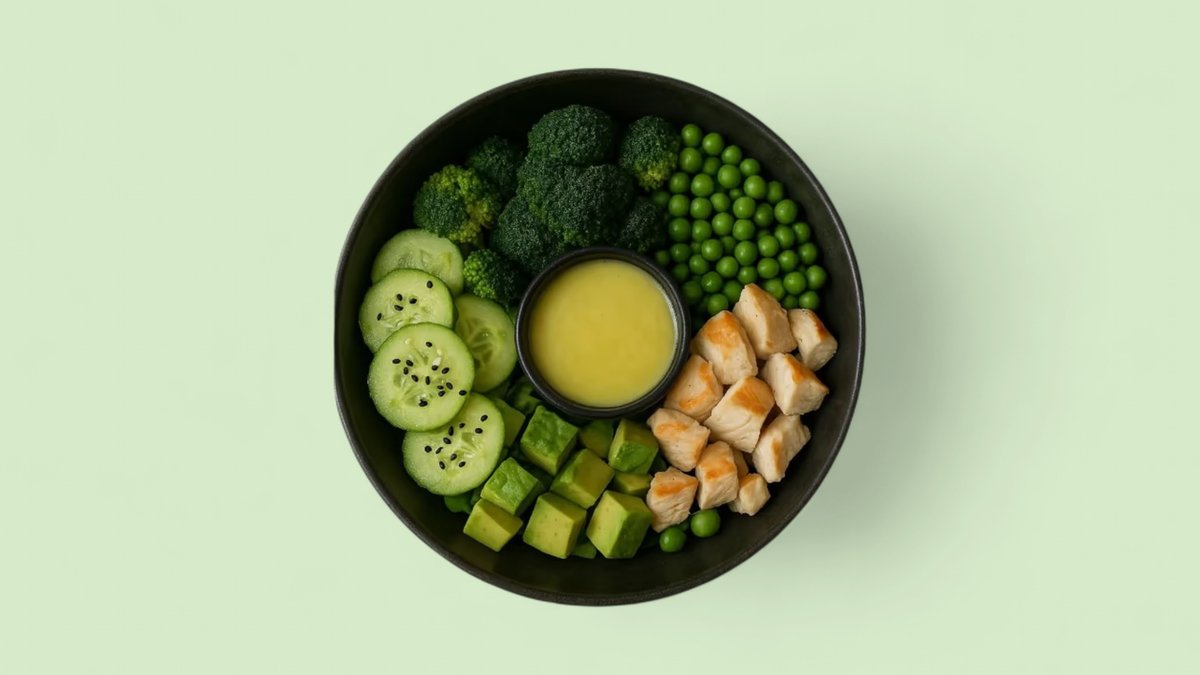 Oriz integral, mish i bardhë, avokado, brokoli, bizele, tranguj