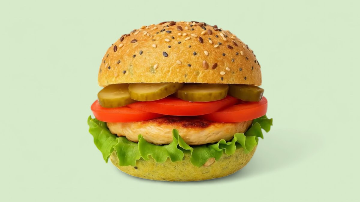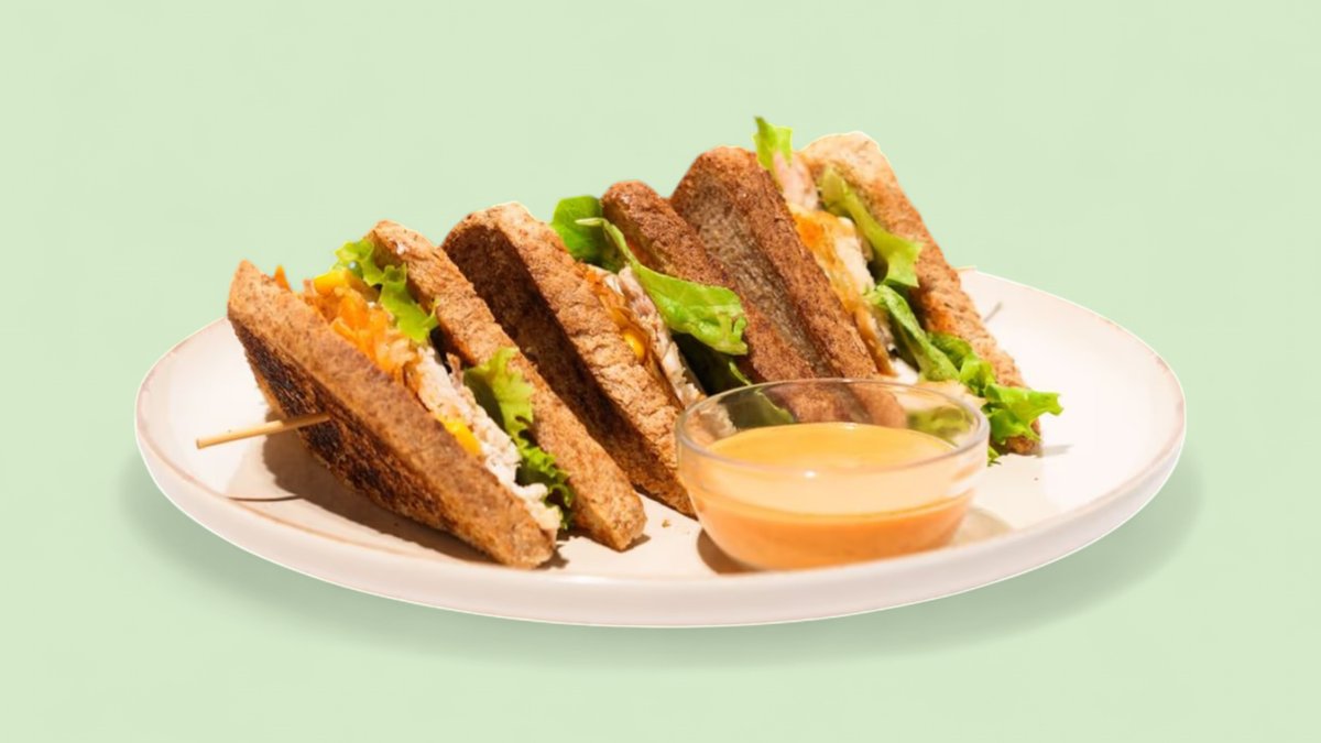 Bukë integrale, mish pule, domate, vezë, karrotë, misër