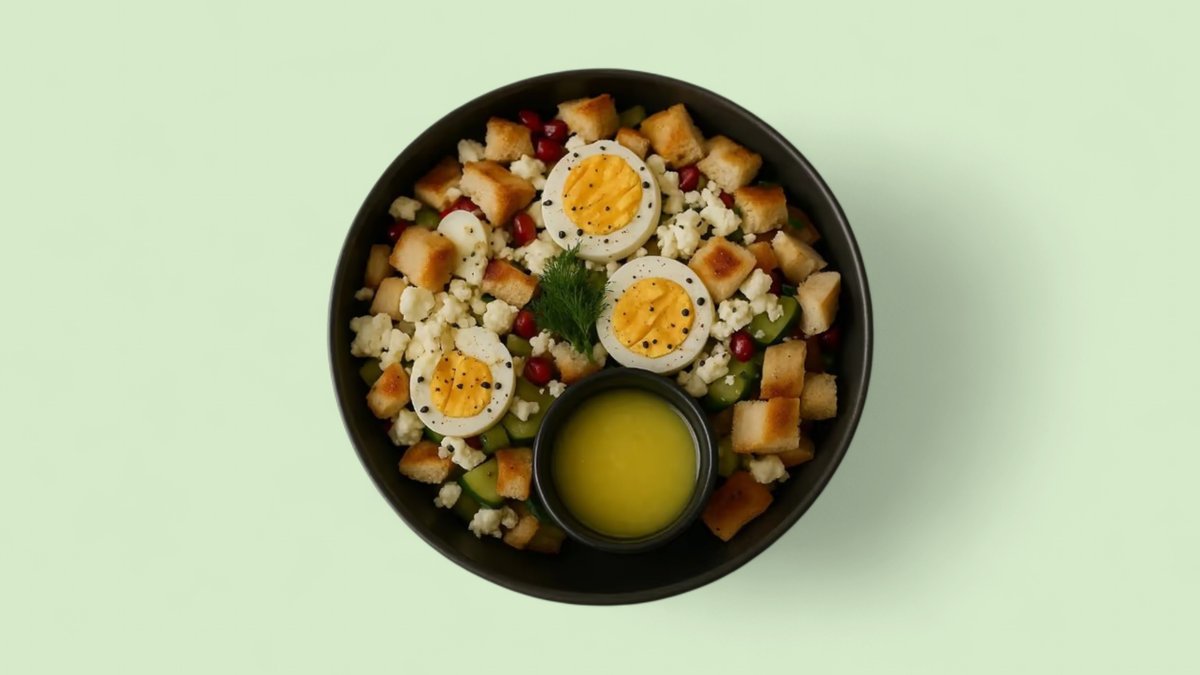 Bukë spinaqi, qofte pule, sallatë e gjelbërt, domate, vezë, tranguj