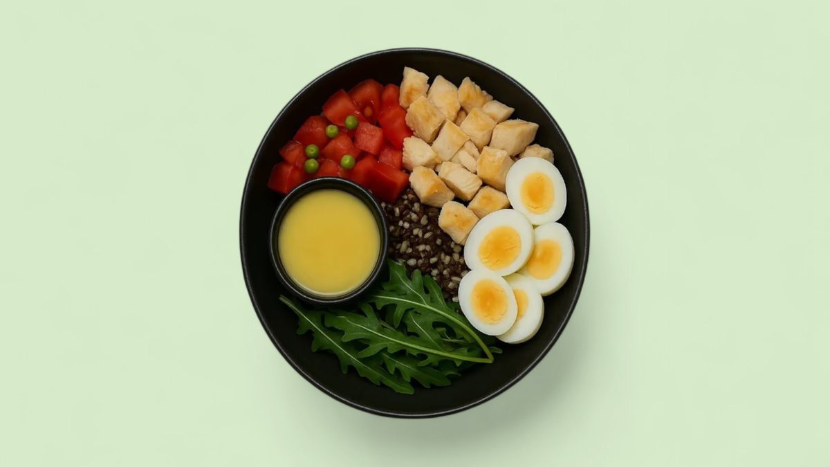 Sallatë e gjelbërt, mish pule, lulelakër, spec i kuq, tranguj, vezë
