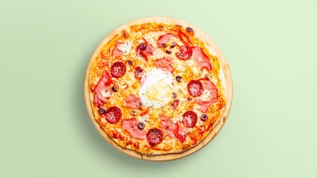Cheese, mushrooms, ham, peppers, eggs, olives
