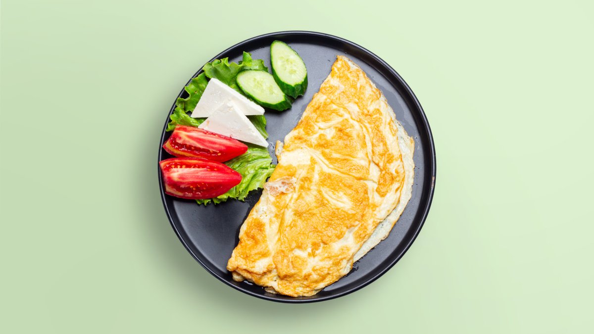 Eggs, cheese, bacon, sausage, mushrooms, green salad, tomatoes, cucumbers, sauce