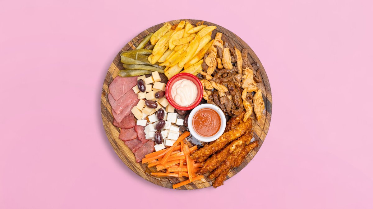 Chicken fingers, wings, beef, bacon, sausage, pickles, carrots, cheese, olives
