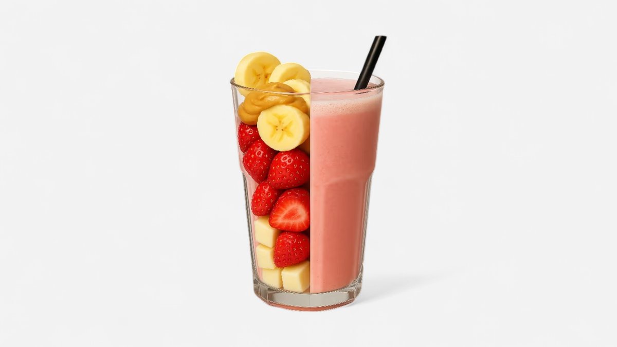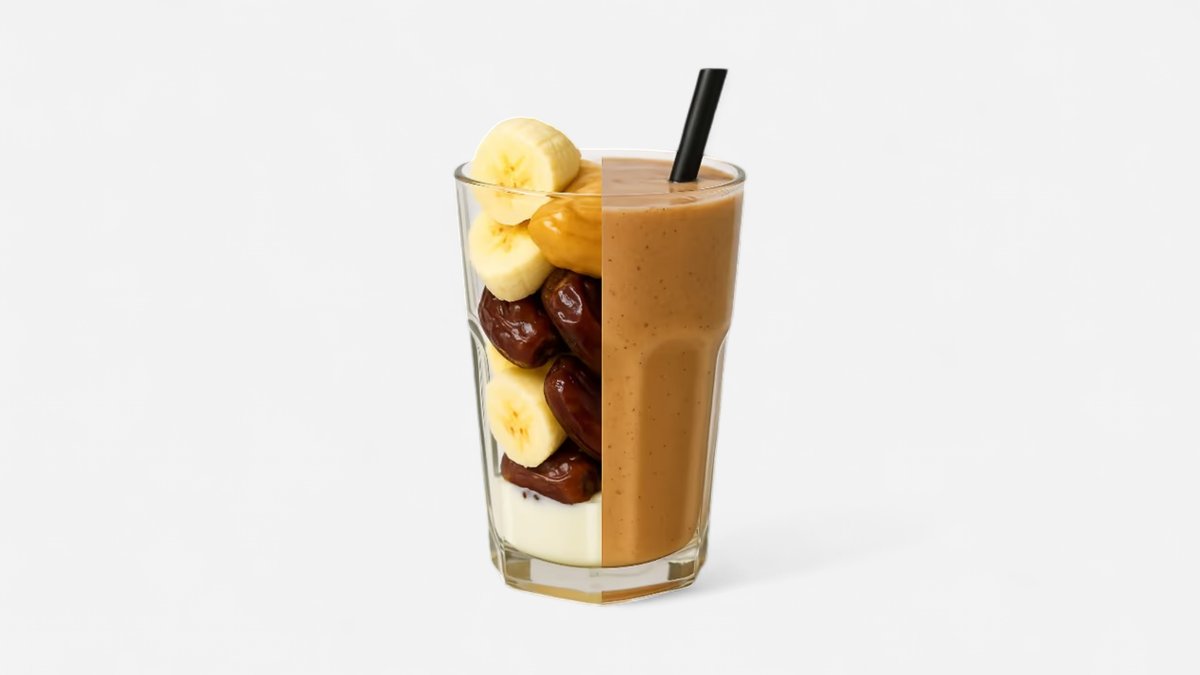 Qumësht, banane, hurma, gjalpë kikiriku dhe akull.
