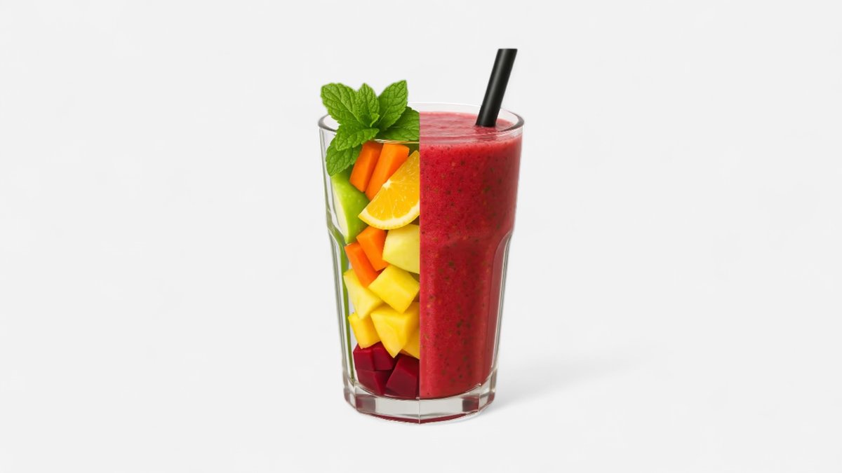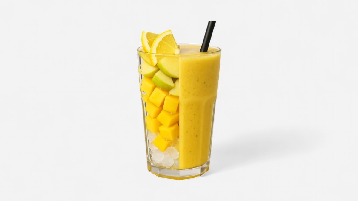 Mango, limon, mollë, mjaltë, ujë kokosi dhe akull.