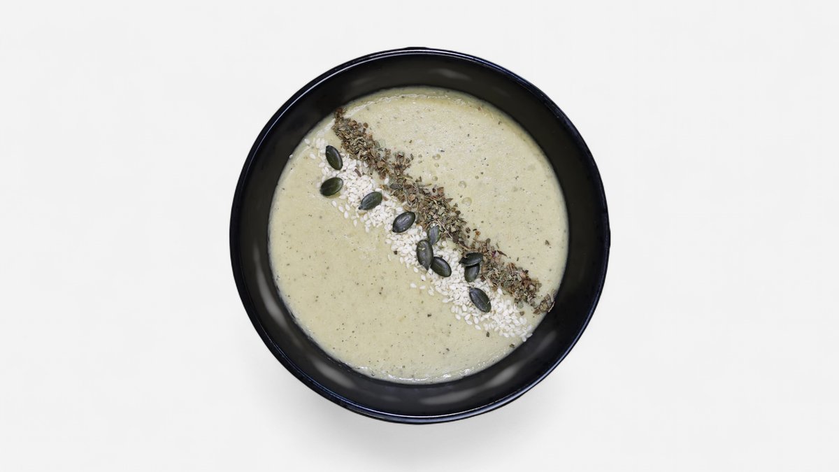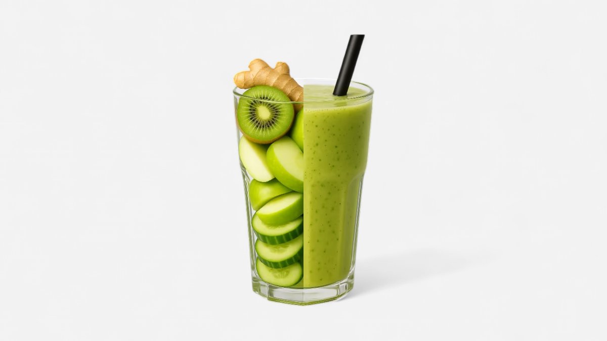 Ujë, spinaq, mango, kivi, mollë e gjelbërt, fara chia dhe akull.